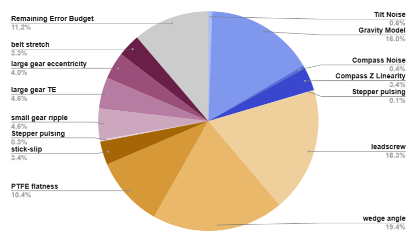 Wedge angle - this one will be difficult to physically improve since it’s limited by machining tolerance, but one solution could be adding in a measurement step during assembly and having the actual wedge dimensions be saved within software for error compensation.