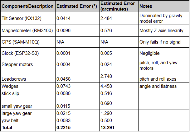 Now that we’ve calculated all theoretical error sources for both the sensors and the mechanical system, lets see how they all stack up. Remember, we need the total tracking error to be less than 15 arcminutes for use in astrophotography.