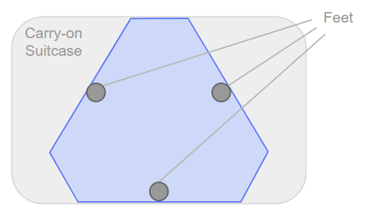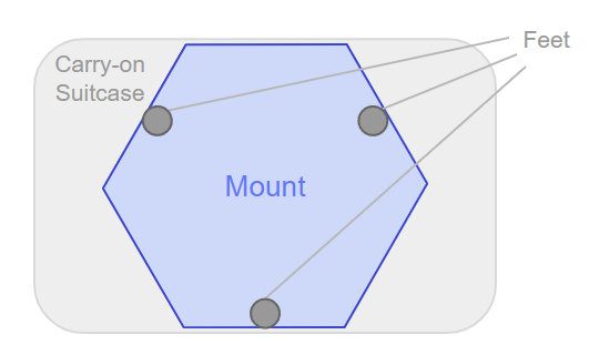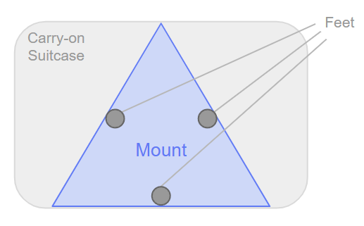 The key to this calculation is figuring out at what point the telescope will cause the platform to tilt and fall over. This happens when the center of gravity of the telescope is placed outside of the area created by the platform’s feet. For example, we’ll be using 3 feet on the platform for stability - as long as the telescope’s center of gravity is directly above the triangle created by these three feet (the “stability triangle”) the whole system will remain stable and upright.