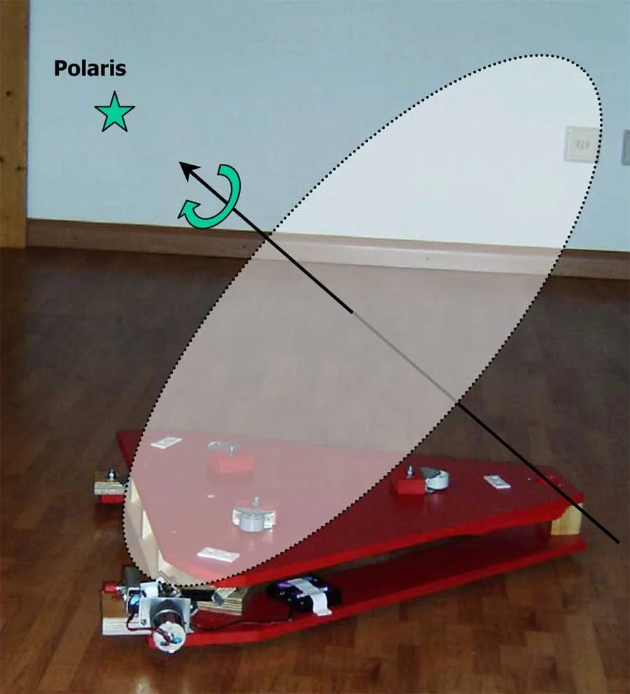 Here’s an example of a traditional equatorial platform, with the axis of rotation overlayed. The rear of the system, shown on the right side of the image, is a pivot point that the top platform rotates around.
